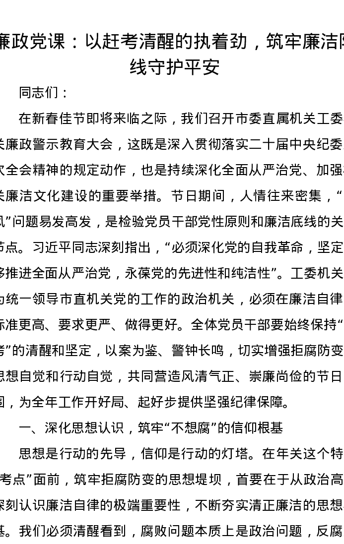 廉政党课讲稿:以赶考清醒的执着劲,筑牢廉洁防线守护平安