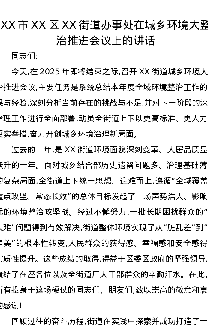 XX市XX区XX街道办事处在城乡环境大整治推进会议上的讲话