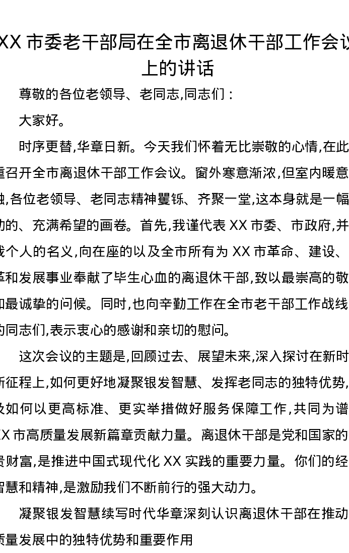 XX市委老干部局在全市离退休干部工作会议上的讲话