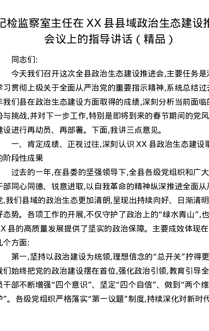 纪检监察室主任在XX县县域政治生态建设推进会议上的指导讲话