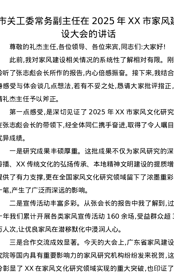 市关工委常务副主任在2025年XX市家风建设大会的讲话