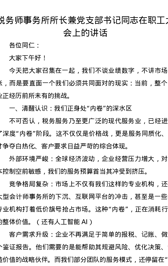 税务师事务所所长兼党支部书记同志在职工大会上的讲话
