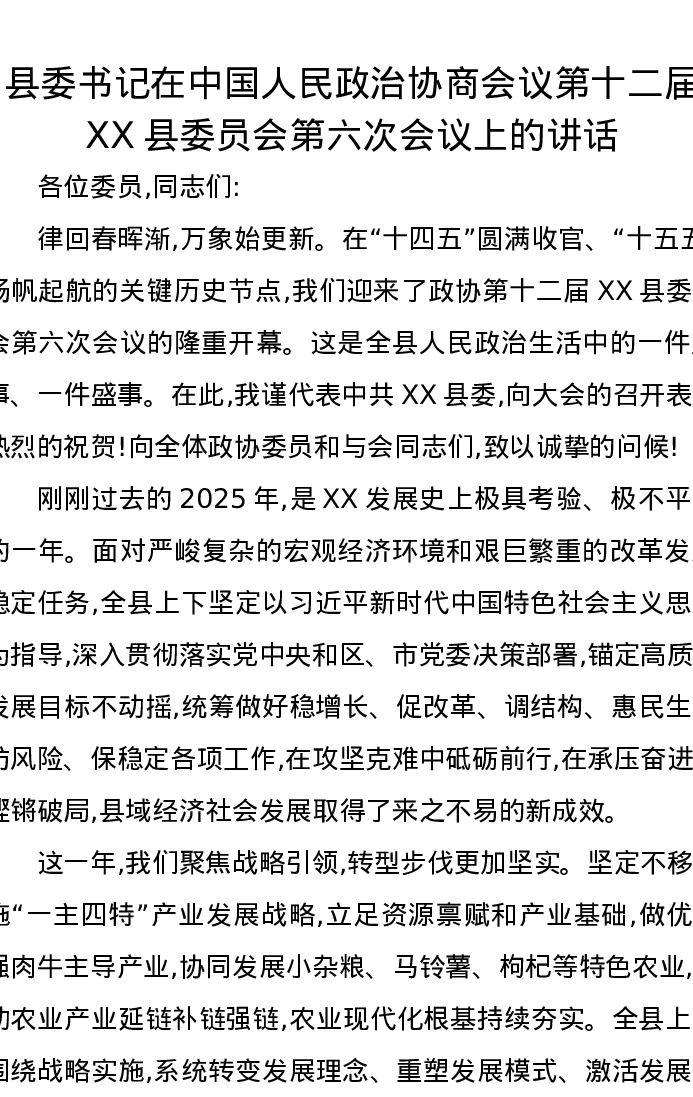 县委书记在中国人民政治协商会议第十二届XX县委员会第六次会议上的讲话