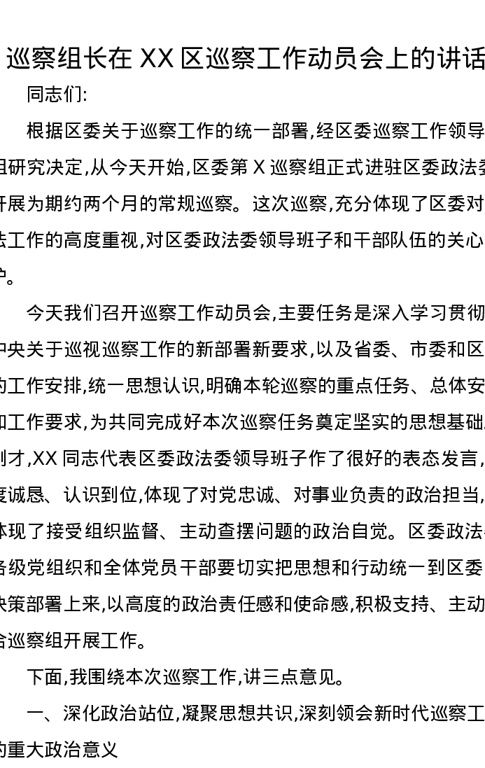 巡察组长在XX区巡察工作动员会上的讲话