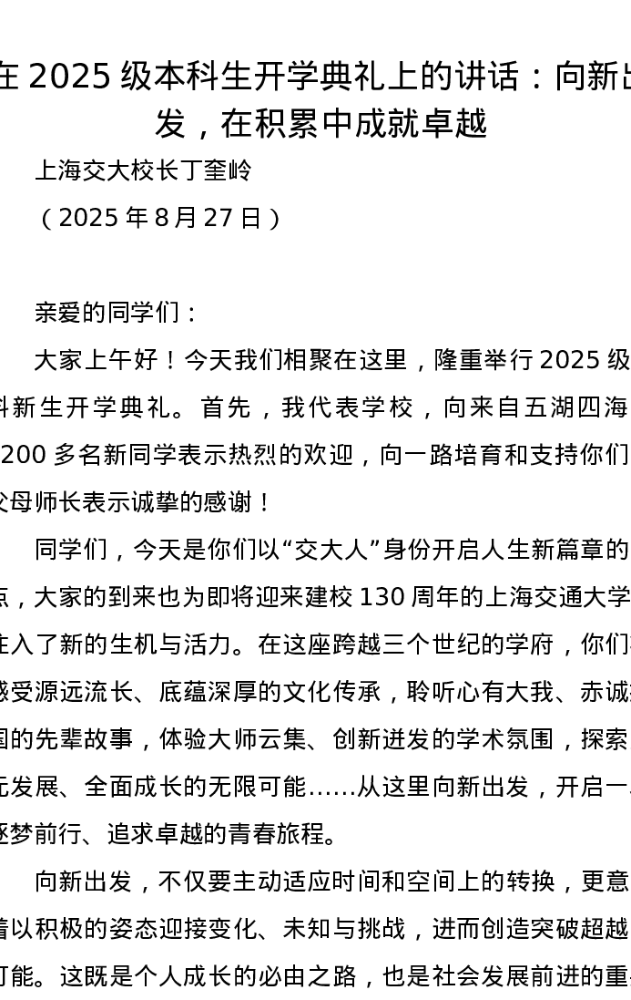 在2025级本科生开学典礼上的讲话:向新出发,在积累中成就卓越