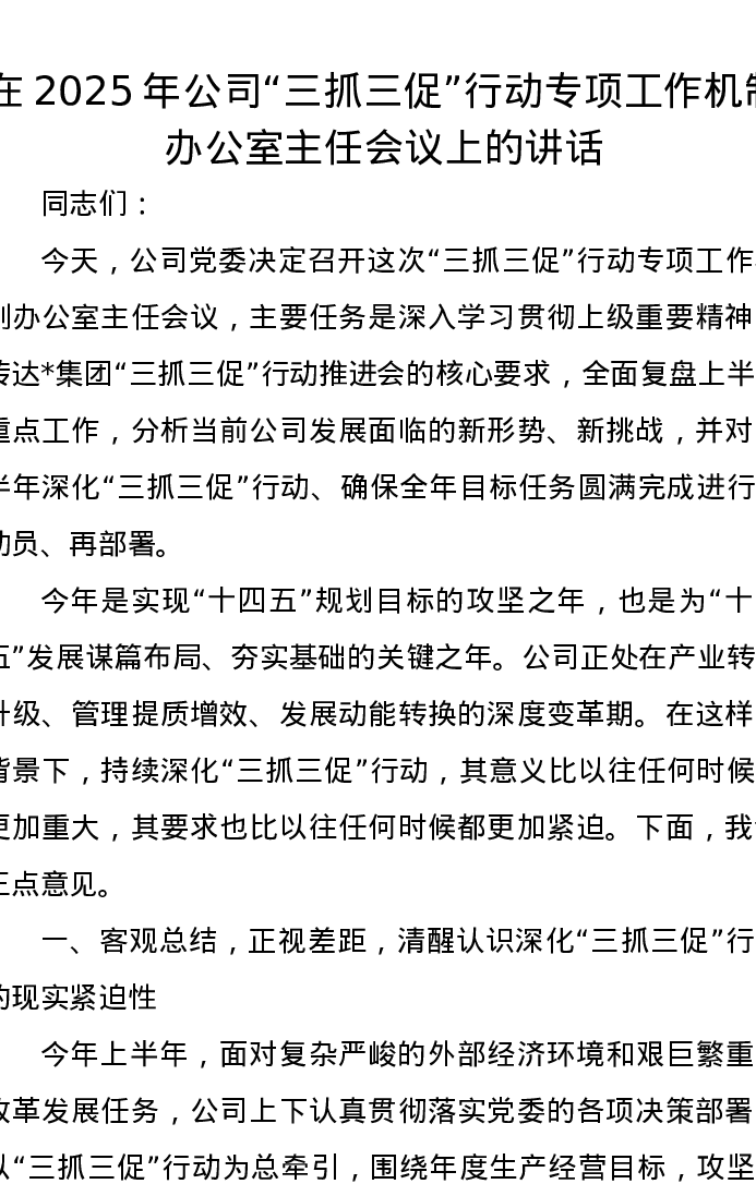 在2025年公司三抓三促行动专项工作机制办公室主任会议上的讲话