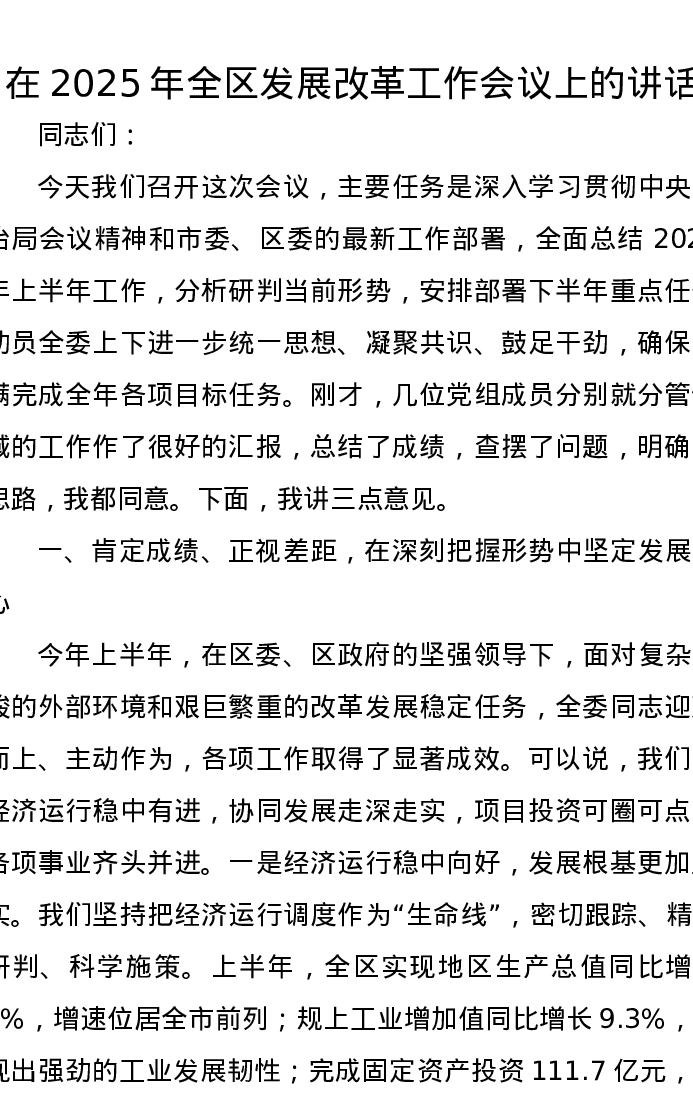 在2025年全区发展改革工作会议上的讲话