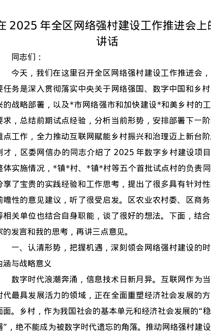 在2025年全区网络强村建设工作推进会上的讲话