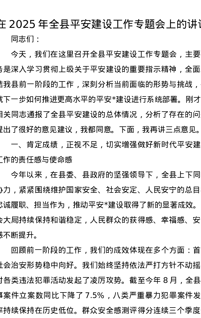 在2025年全县平安建设工作专题会上的讲话