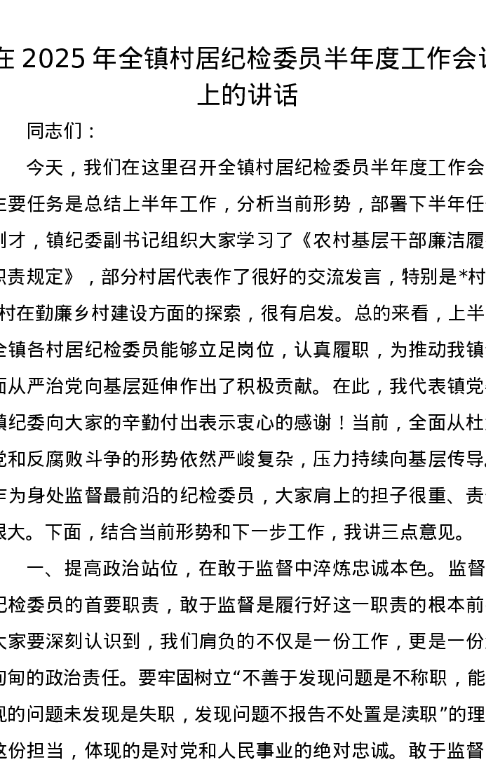 在2025年全镇村居纪检委员半年度工作会议上的讲话