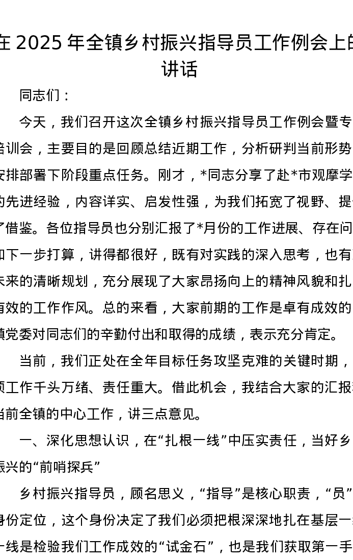 在2025年全镇乡村振兴指导员工作例会上的讲话