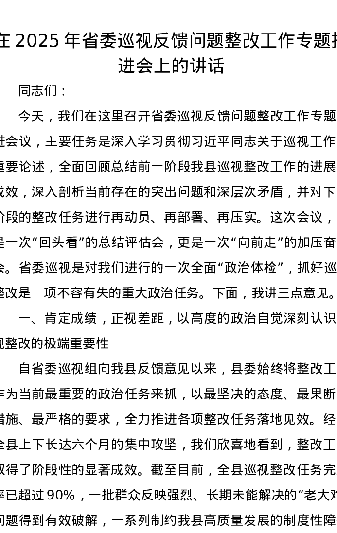 在2025年省委巡视反馈问题整改工作专题推进会上的讲话
