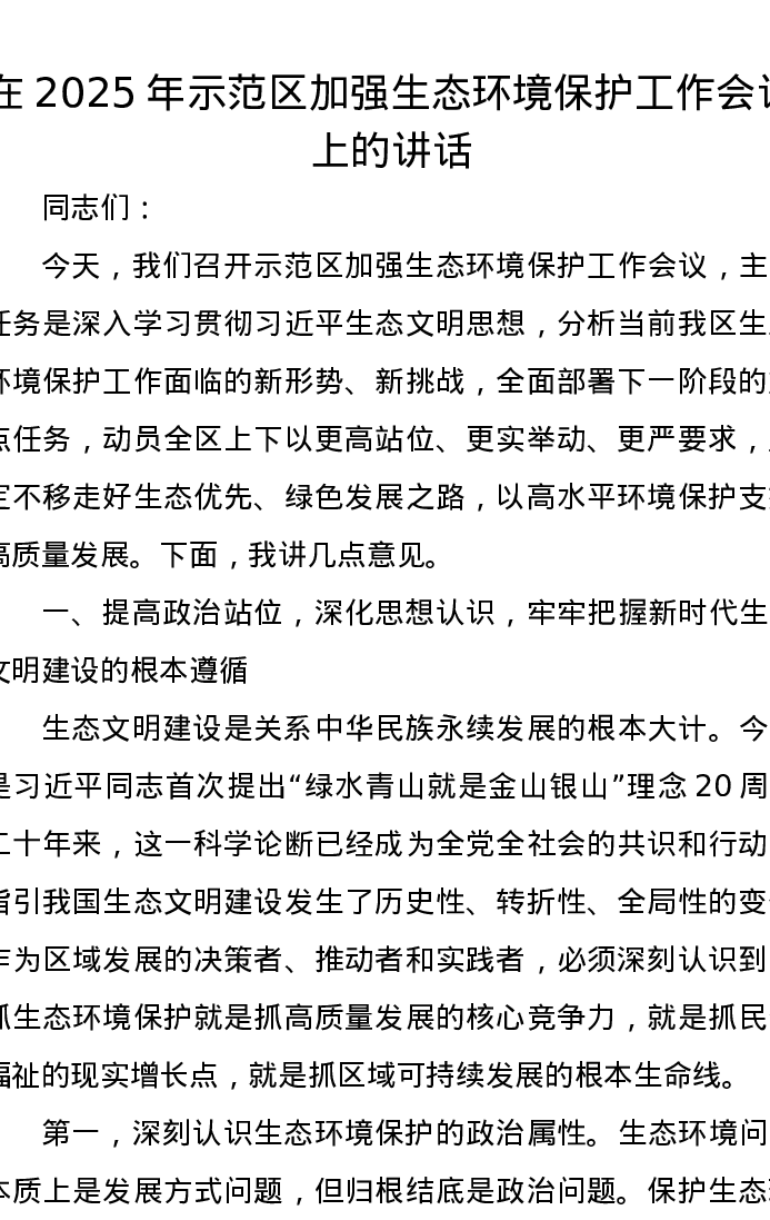 在2025年示范区加强生态环境保护工作会议上的讲话
