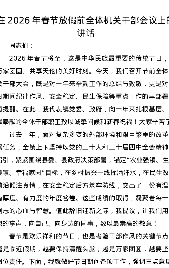 在2026年春节放假前全体机关干部会议上的讲话