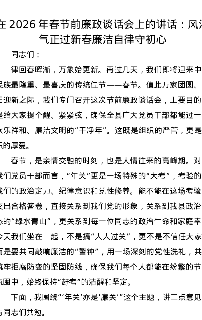 在2026年春节前廉政谈话会上的讲话:风清气正过新春 廉洁自律守初心