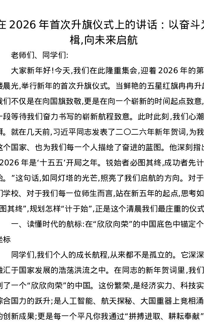 在2026年首次升旗仪式上的讲话:以奋斗为楫,向未来启航