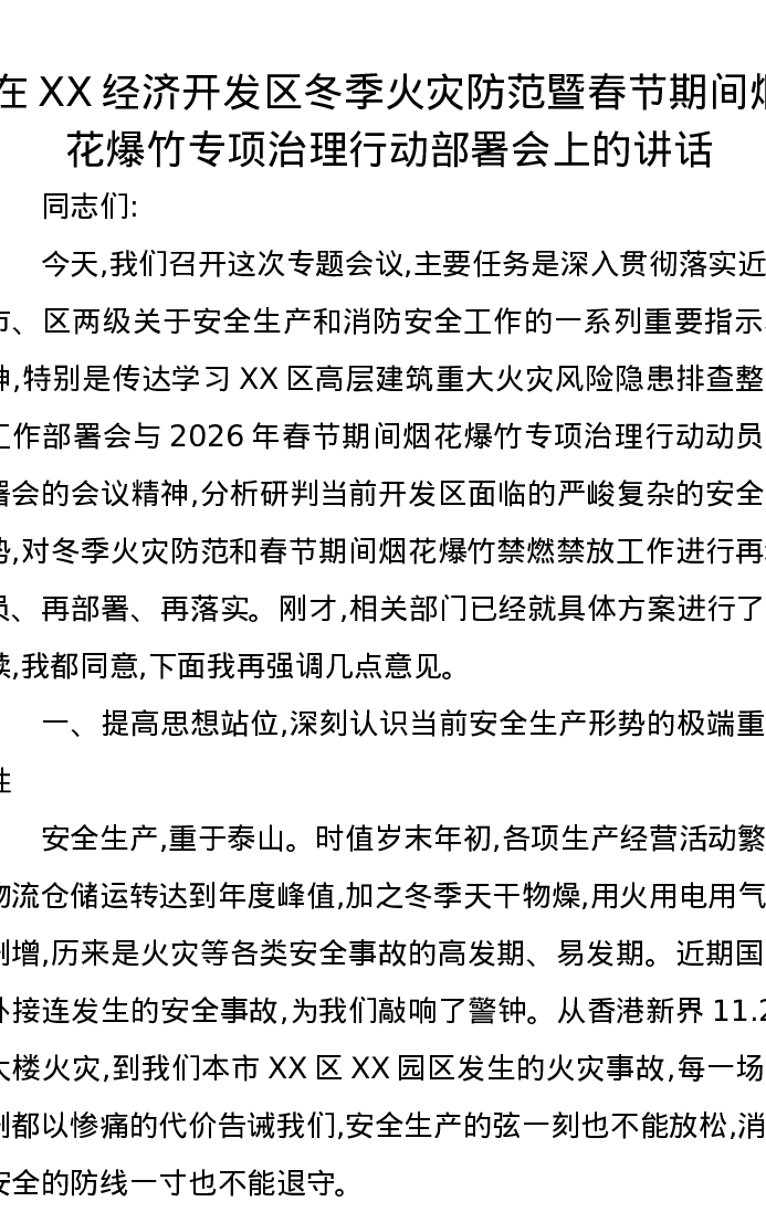 在XX经济开发区冬季火灾防范暨春节期间烟花爆竹专项治理行动部署会上的讲话