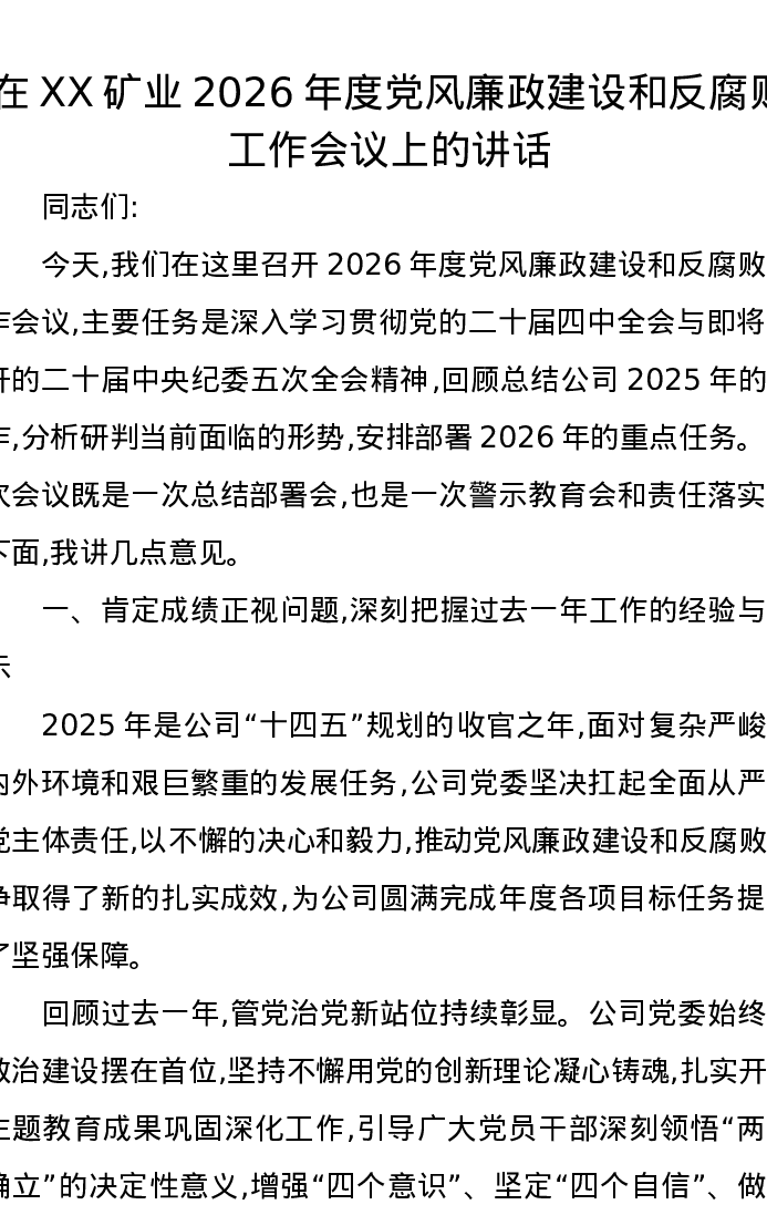 在XX矿业2026年度党风廉政建设和反腐败工作会议上的讲话