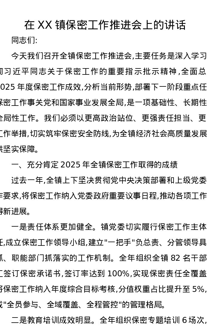 在XX镇保密工作推进会上的讲话