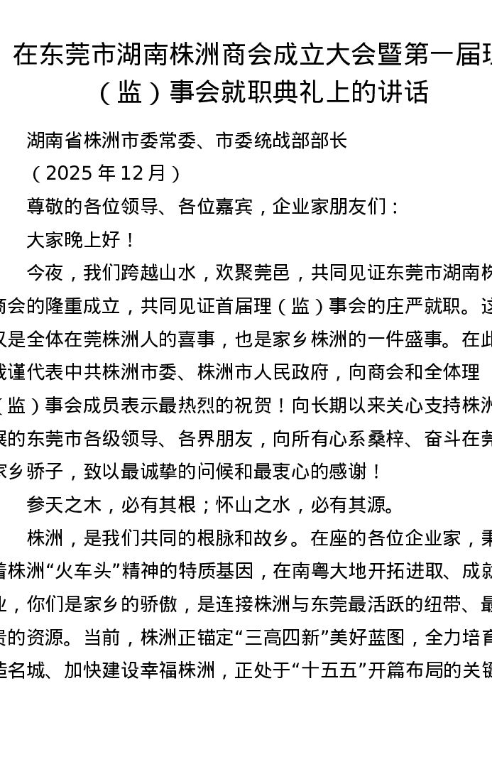 在东莞市湖南株洲商会成立大会暨第一届理(监)事会就职典礼上的讲话