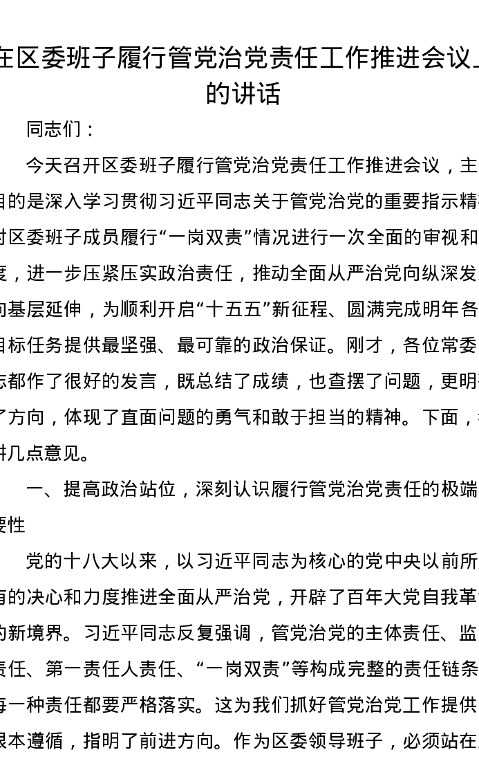 在区委班子履行管党治党责任工作推进会议上的讲话