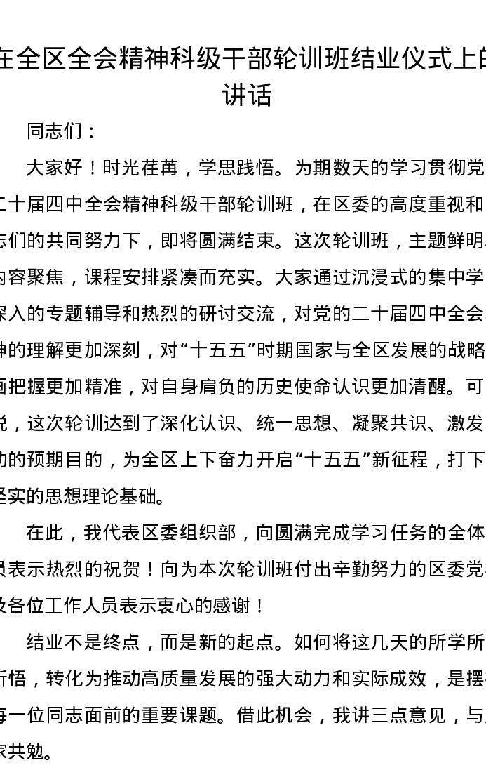 在全区全会精神科级干部轮训班结业仪式上的讲话