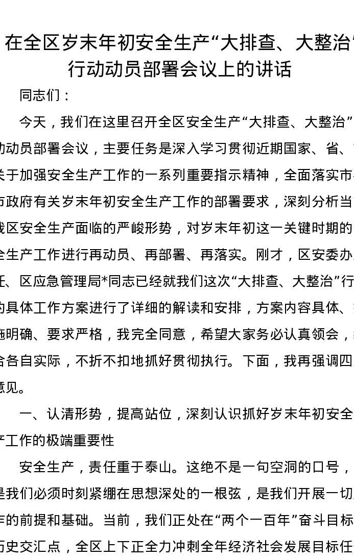 在全区岁末年初安全生产大排查、大整治行动动员部署会议上的讲话