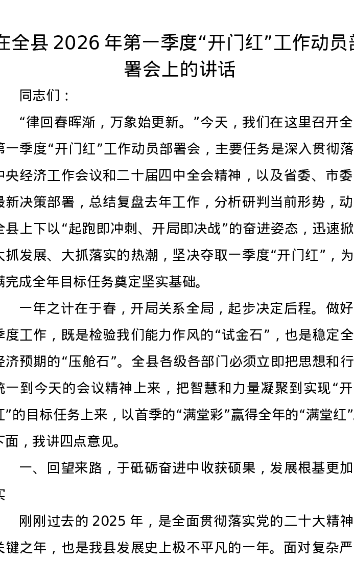 在全县2026年第一季度开门红工作动员部署会上的讲话