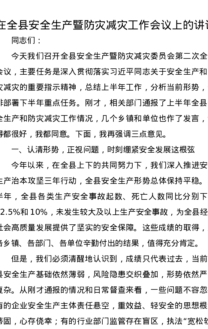 在全县安全生产暨防灾减灾工作会议上的讲话