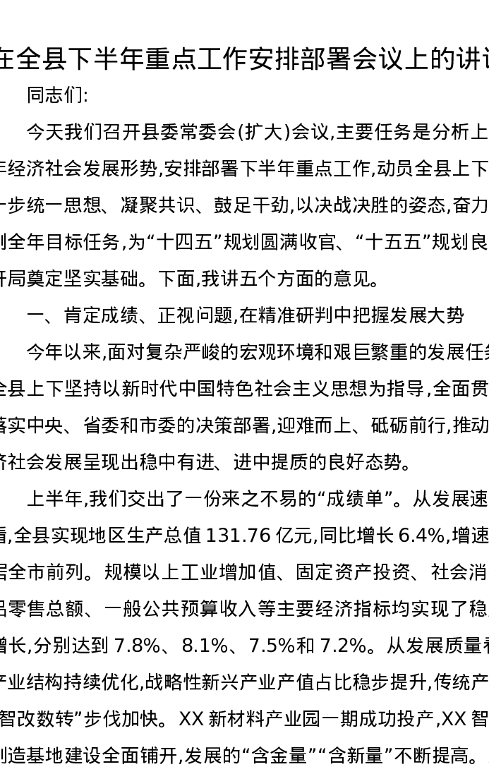 在全县下半年重点工作安排部署会议上的讲话