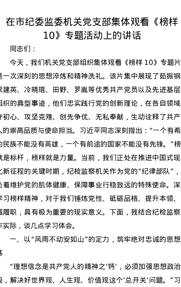 在市纪委监委机关党支部集体观看《榜样10》专题活动上的讲话