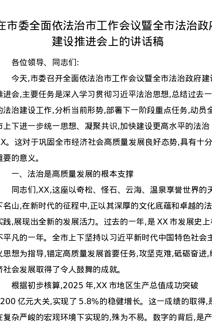 在市委全面依法治市工作会议暨全市法治政府建设推进会上的讲话稿
