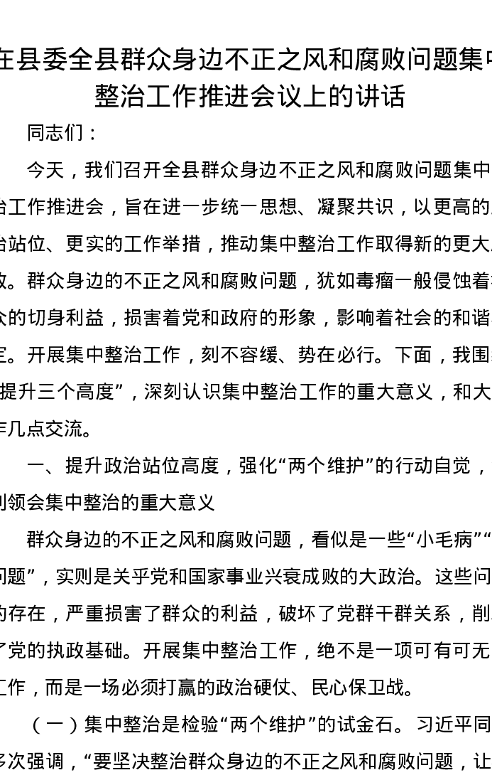 在县委全县群众身边不正之风和腐败问题集中整治工作推进会议上的讲话