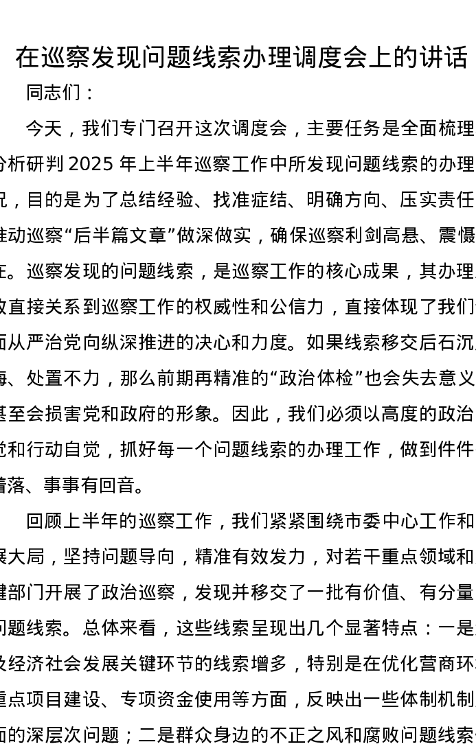 在巡察发现问题线索办理调度会上的讲话