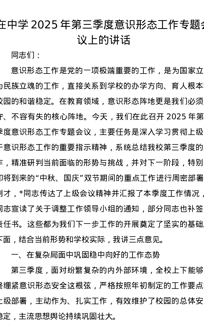 在中学2025年第三季度意识形态工作专题会议上的讲话