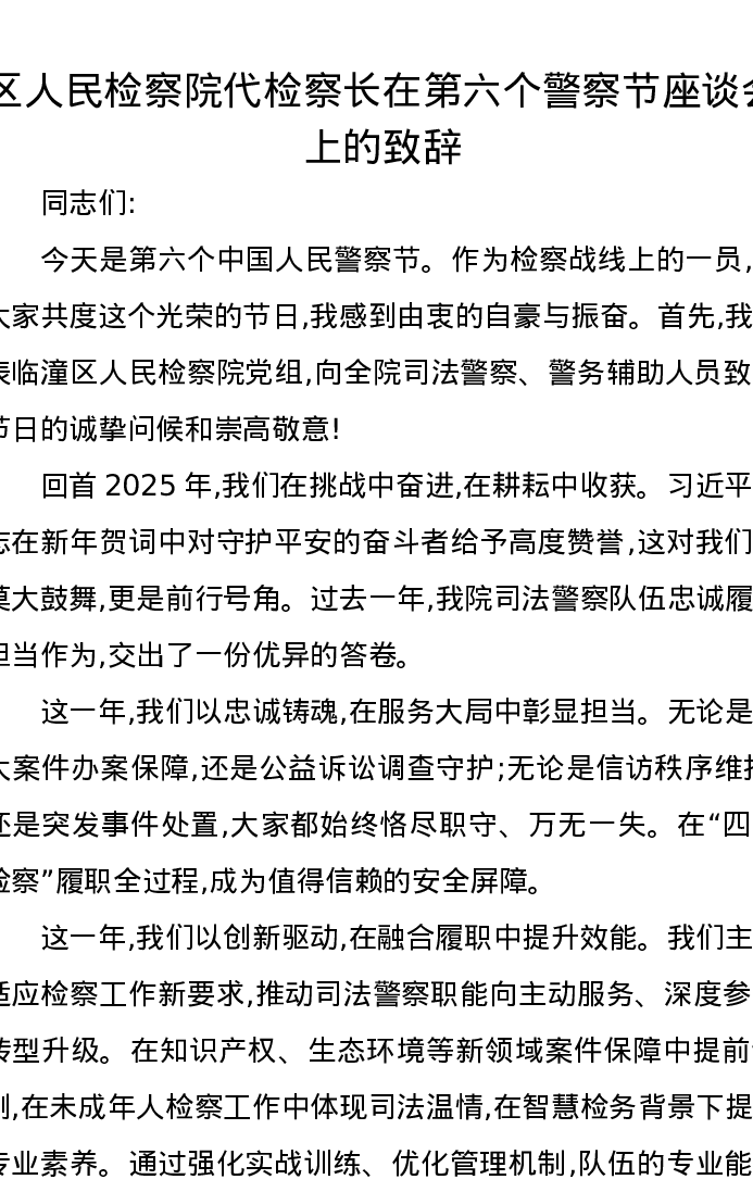 区人民检察院代检察长在第六个警察节座谈会上的致辞