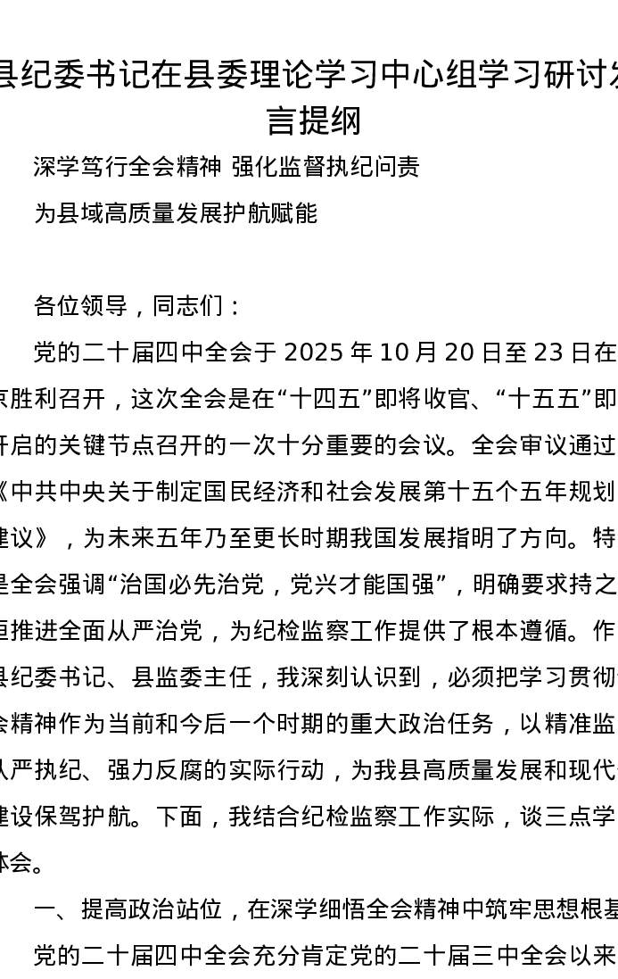 县纪委书记在县委理论学习中心组学习研讨发言提纲