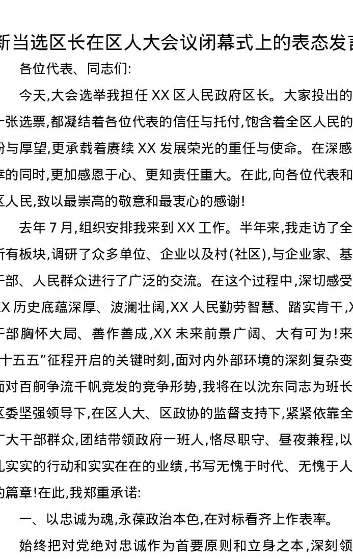 新当选区长在区人大会议闭幕式上的表态发言