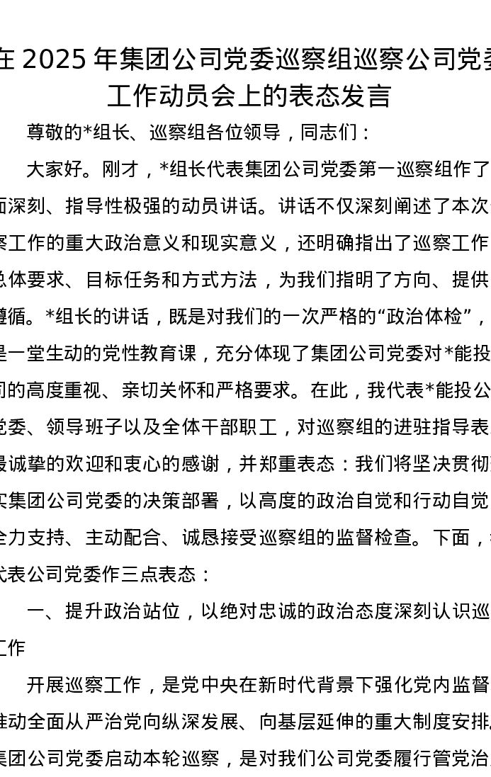 在2025年集团公司党委巡察组巡察公司党委工作动员会上的表态发言