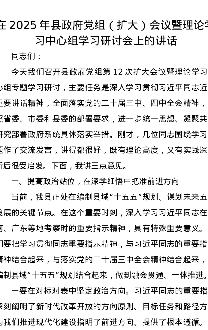 在2025年县政府党组(扩大)会议暨理论学习中心组学习研讨会上的讲话