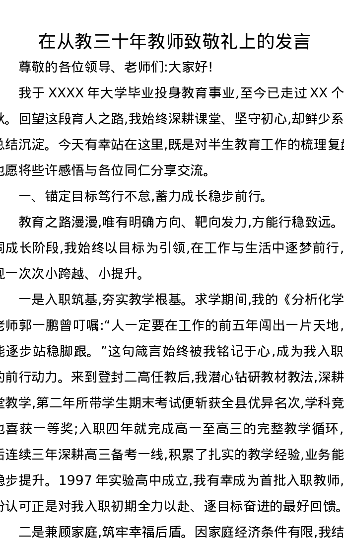 在从教三十年教师致敬礼上的发言
