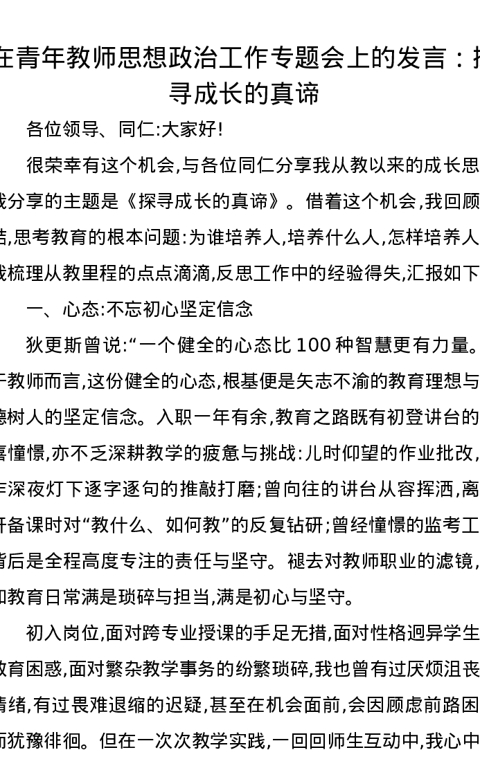 在青年教师思想政治工作专题会上的发言:探寻成长的真谛