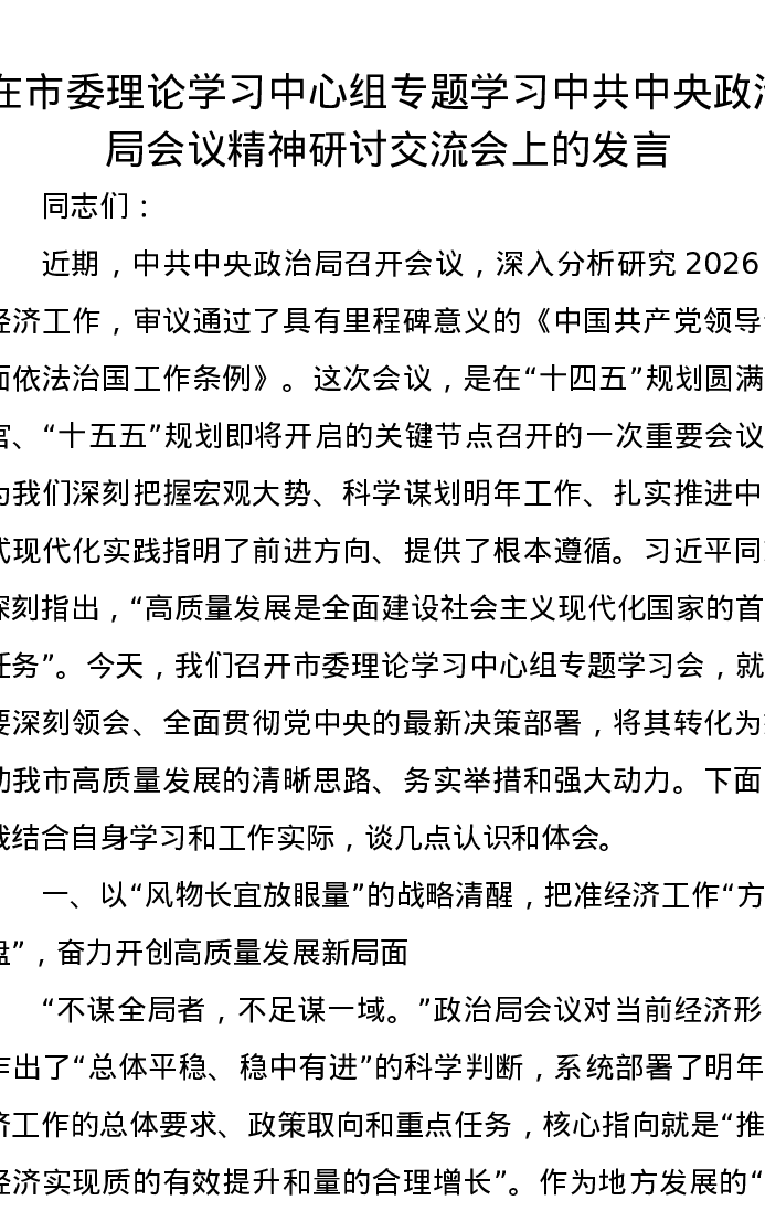 在市委理论学习中心组专题学习中共中央政治局会议精神研讨交流会上的发言