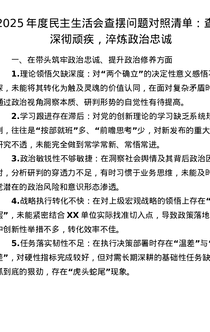 2025年度xxxxx查摆问题对照清单:查纠深彻顽疾,淬炼政治忠诚