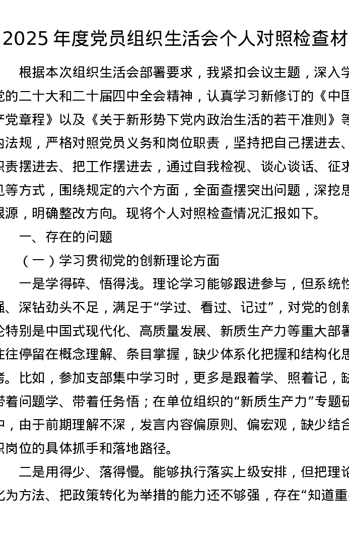 2025年度党员组织xxx个人对照检查材料(最新六方面4000字)