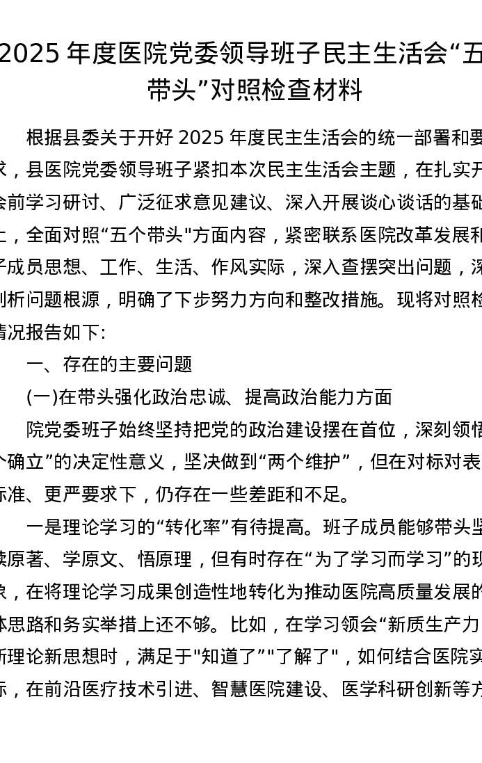 2025年度医院党委领导班子xxxxx五个带头对照检查材料范文