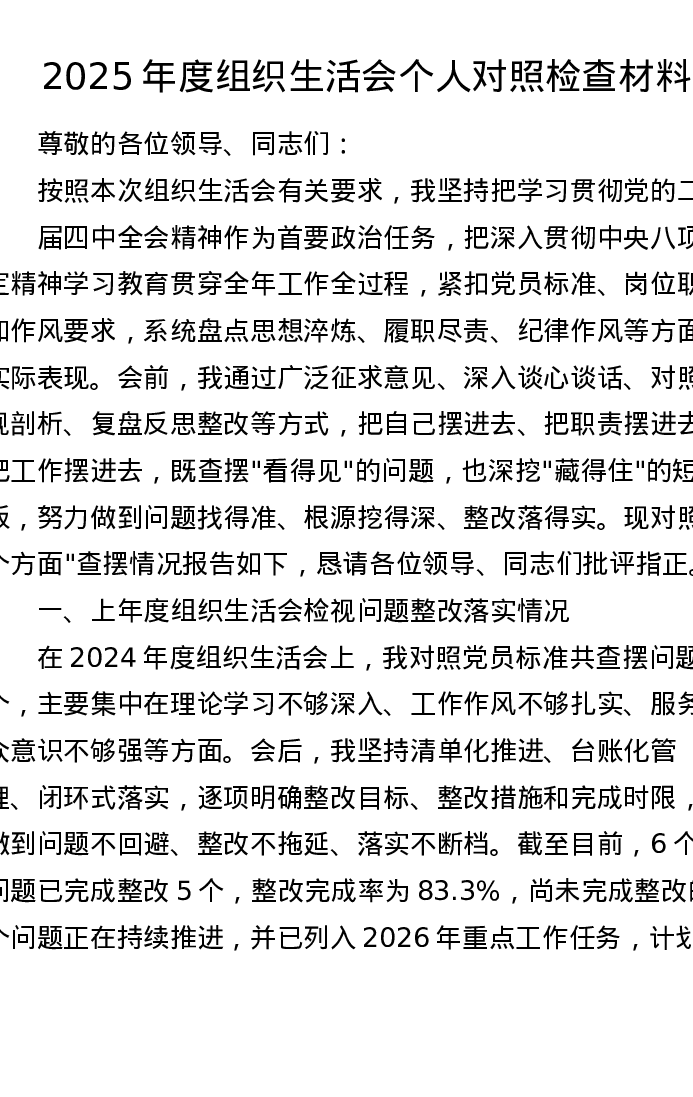 2025年度组织xxx个人对照检查6400字(含民族共同体意识,含上年度整改情况)