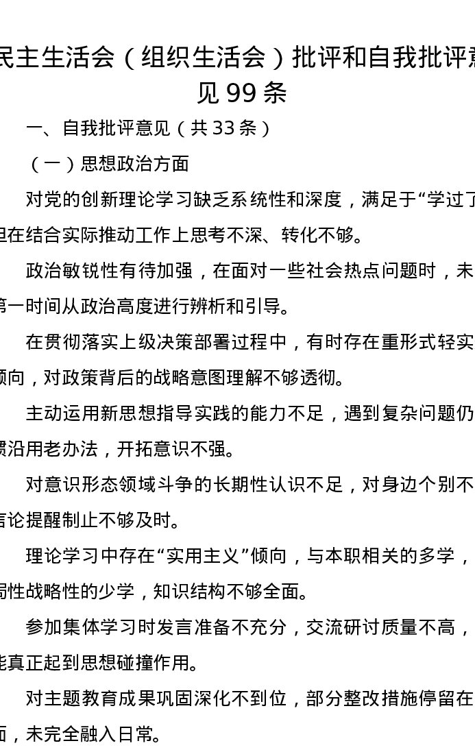 xxxxx(组织xxx)批评和自我批评意见99条