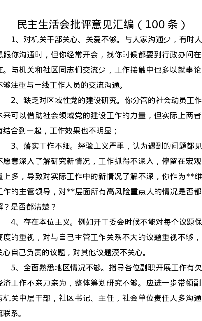 xxxxx批评意见汇编(100条)