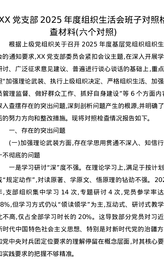 XX党支部2025年度组织xxx班子对照检查材料(六个对照)